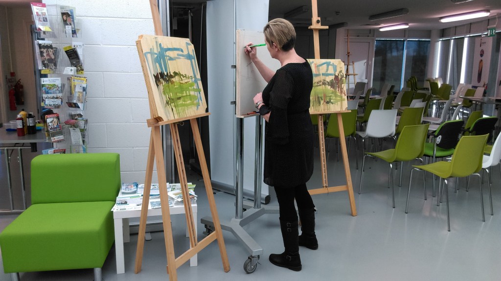 Susan Farrelly, James McLoughlin and Omin contributing to Perpetual Drawing + 2 Landscapes, presented at First Fortnight: Insight Out at Creative Spark, Dundalk, January 2018