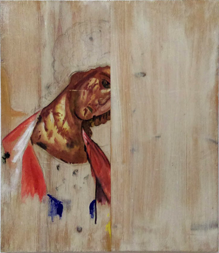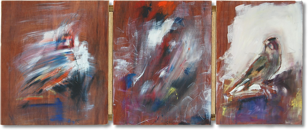 Goldfinch Goldfinch, 3 Studies (After Fabritius)[Oil on plywood. 84 x 34 x 6.5 cm, 2009] Study: Rublev – 1992[Oil on polyfiller on spruce. 50 x 50 x 3 cm , 1992] Montage 1996 (Rogier van der Weyden – Kitchen – Breakfast Table) [Oil on beech, 21 x 15 x 3 cm each. 1996] Study: Detail from The Book of Hours of the Duke of Berry [Oil on paper on plywood, 22 x 15 x 4 cm, 2018] Next: Pentaptych